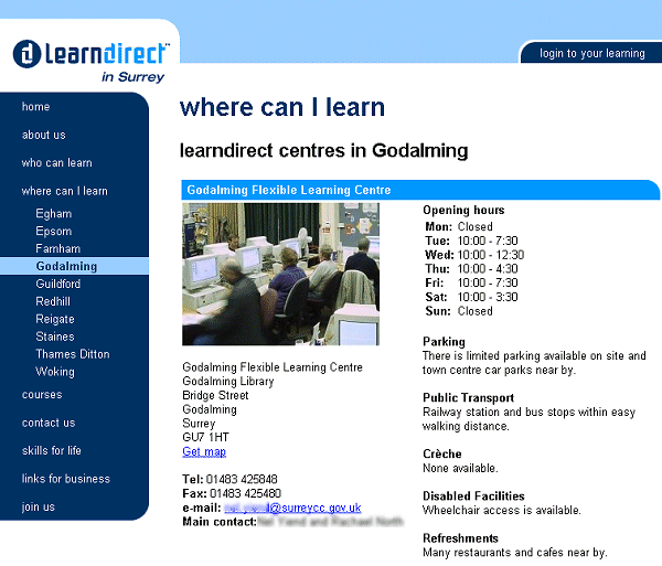 I built the learndirect in Surrey website for the manger of the Surrey Hub after advising her on how to go about setting up a web space and maintain a site.